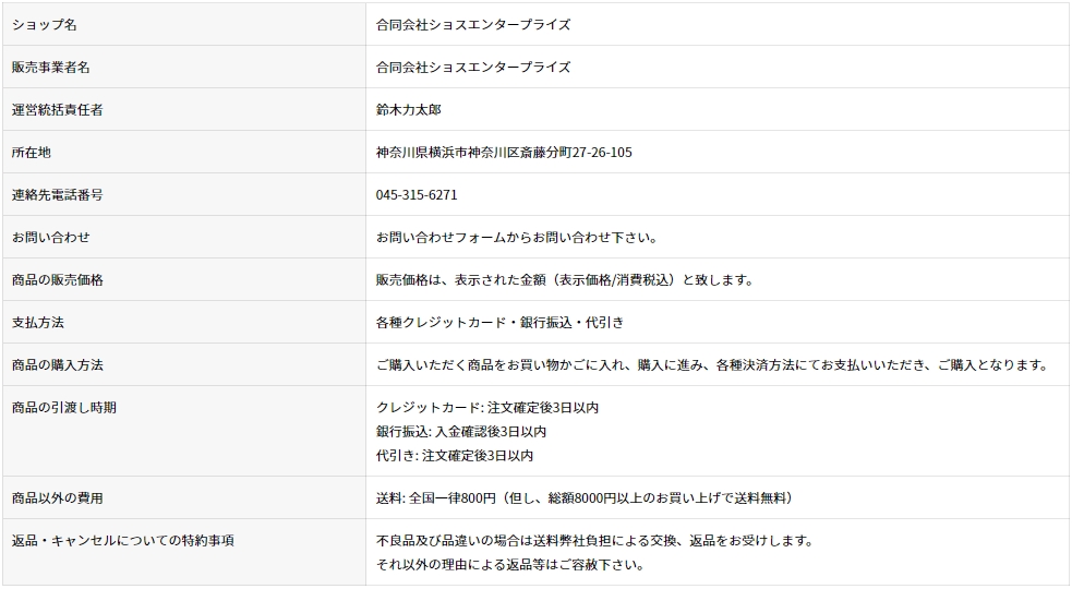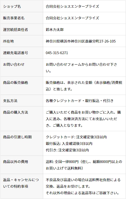 ショップ名合同会社ショスエンタープライズ販売事業者名合同会社ショスエンタープライズ運営統括責任者鈴木力太郎所在地神奈川県横浜市神奈川区斎藤分町27-26-105連絡先電話番号045-315-6271お問い合わせお問い合わせフォームからお問い合わせ下さい。商品の販売価格販売価格は、表示された金額(表示価格/消費税込)と致します。支払方法各種クレジットカード・銀行振込・代引き商品の購入方法ご購入いただく商品をお買い物かごに入れ、購入に進み、各種決済方法にてお支払いいただき、ご購入となります。商品の引渡し時期クレジットカード: 注文確定後3日以内銀行振込: 入金確認後3日以内代引き: 注文確定後3日以内商品以外の費用送料: 全国一律800円(但し、総額8000円以上のお買い上げで送料無料)返品・キャンセルについての特約事項不良品及び品違いの場合は送料弊社負担による交換、返品をお受けします。それ以外の理由による返品等はご容赦下さい。